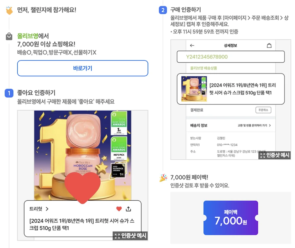 페이백 마케팅은 고객이 먼저 제품을 구매한 후, 정해진 인증을 완료하면 구매 금액의 일부를 현금이나 포인트로 돌려주어, 단기적인 구매 유인을 극대화하는 방식입니다. 특히 순위가 중요한 플랫폼에서 강력한 효과를 발휘합니다. 대표적으로는 챌린저스를 통한 페이백 마케팅이 있습니다. 습관 형성 앱으로 알려져 있는 챌린저스는 뷰티 득템 플랫폼으로 전환하면서, 올리브영 등의 주요 쇼핑 플랫폼과 연계한 페이백 시스템을 운영하고 있습니다. 정해진 시간에 제품을 구매하거나 좋아요 인증, 인스타그램 업로드, 리뷰 작성 등의 미션을 수행하면 환급을 해주는 구조입니다.