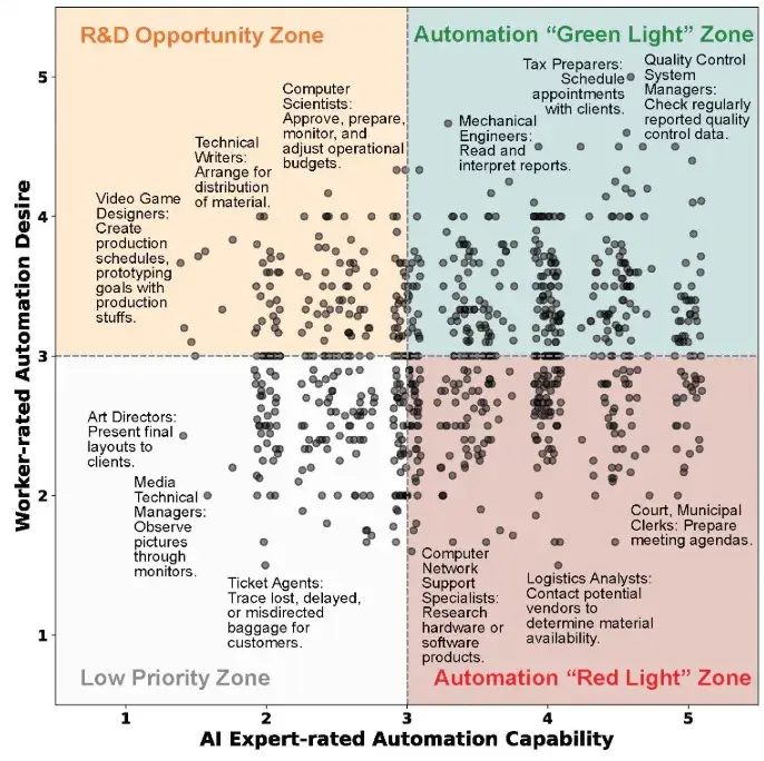 그런데 사람들이 AI에게 가장 맡기고 싶어하는 핵심 태스크들 중에는, 아직까지 AI가 잘하지 못하는 업무도 존재합니다. 연구팀은 이를 추후 R&D가 필요한 기회지대로 분류했는데요.