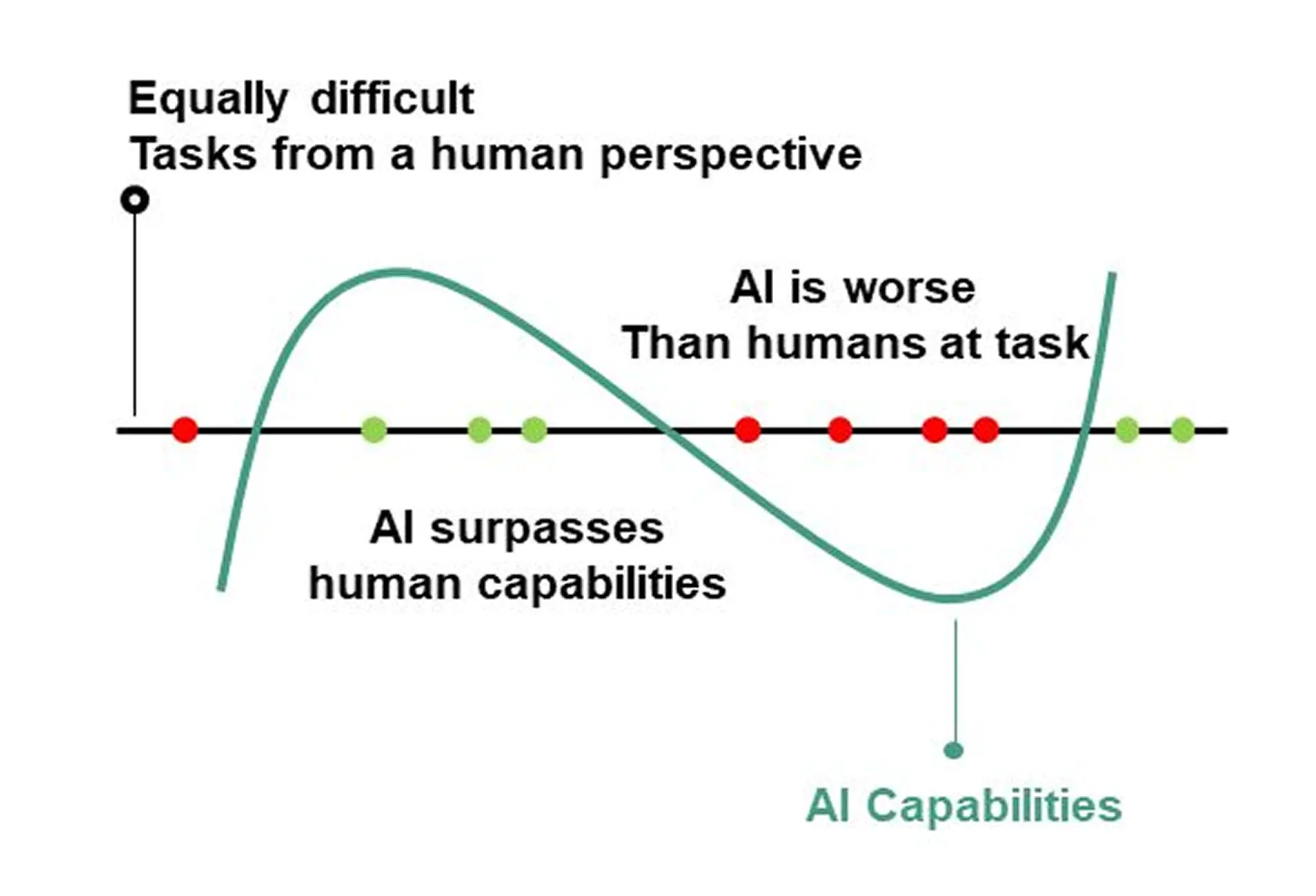AI의 능력치는 마치 톱니바퀴처럼 들쭉날쭉한 형태를 띠고 있습니다. 어떤 업무에서는 인간 상위 1%의 능력을 보여주지만, 바로 옆에 있는 아주 기초적인 업무에서는 엉망진창의 결과물을 내기도 하죠.
