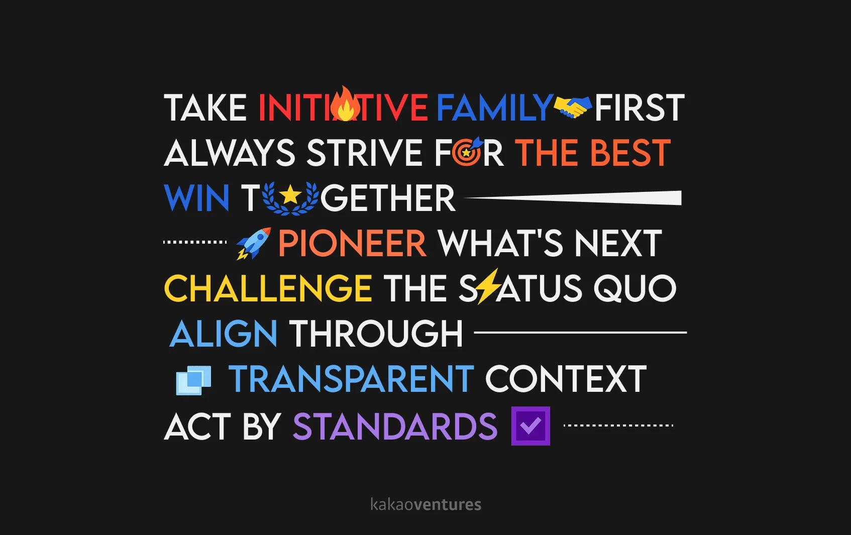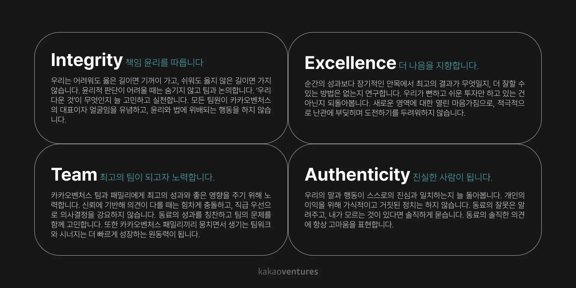 혼자 잘하는 건 한계가 있습니다. 내가 아무리 빠르게 달려도, 팀이 따라오지 못하면 결국 멀리 가지 못합니다. 그래서 우리는 개인의 성과보다 함께 이기는 것을 중요하게 생각합니다. 나 한 명의 성과, 우리 팀만의 성과가 아니라 카카오벤처스 전체의 성과가 진짜 승리입니다.