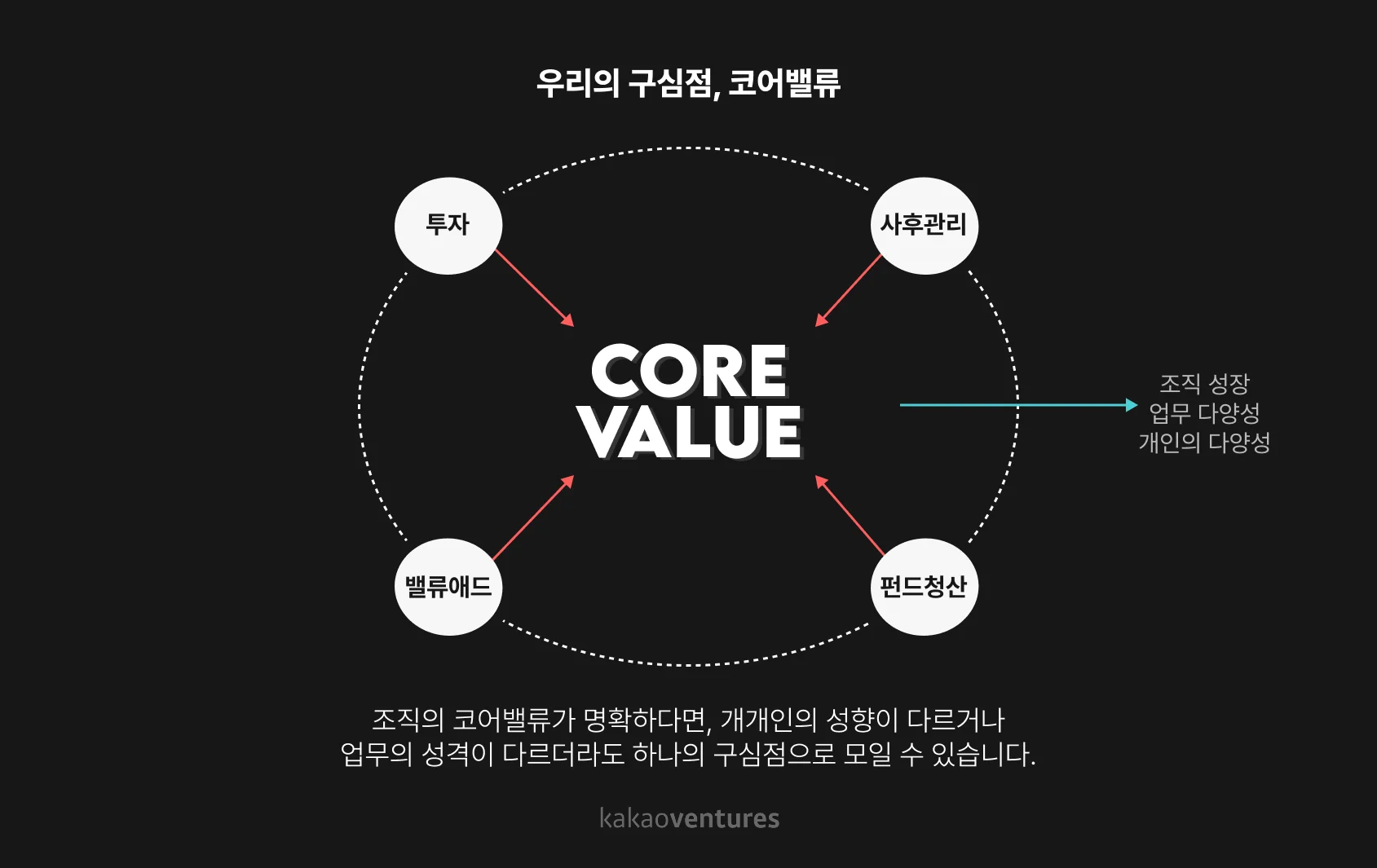 브라이언 카카오벤처스는 일반 VC와는 다르게 팀으로 일을 많이 해요. 투자도, 사후 관리도, 밸류애드도, 펀드 청산도 모두 팀으로 움직이죠. 그래서 저희에게는 팀워크가 무척 중요합니다. 팀이 커지면서 밖으로 뻗어나가는 원심력이 생길 때, 그걸 잡아주는 구심점이 조직문화, 코어밸류라고 생각해요.