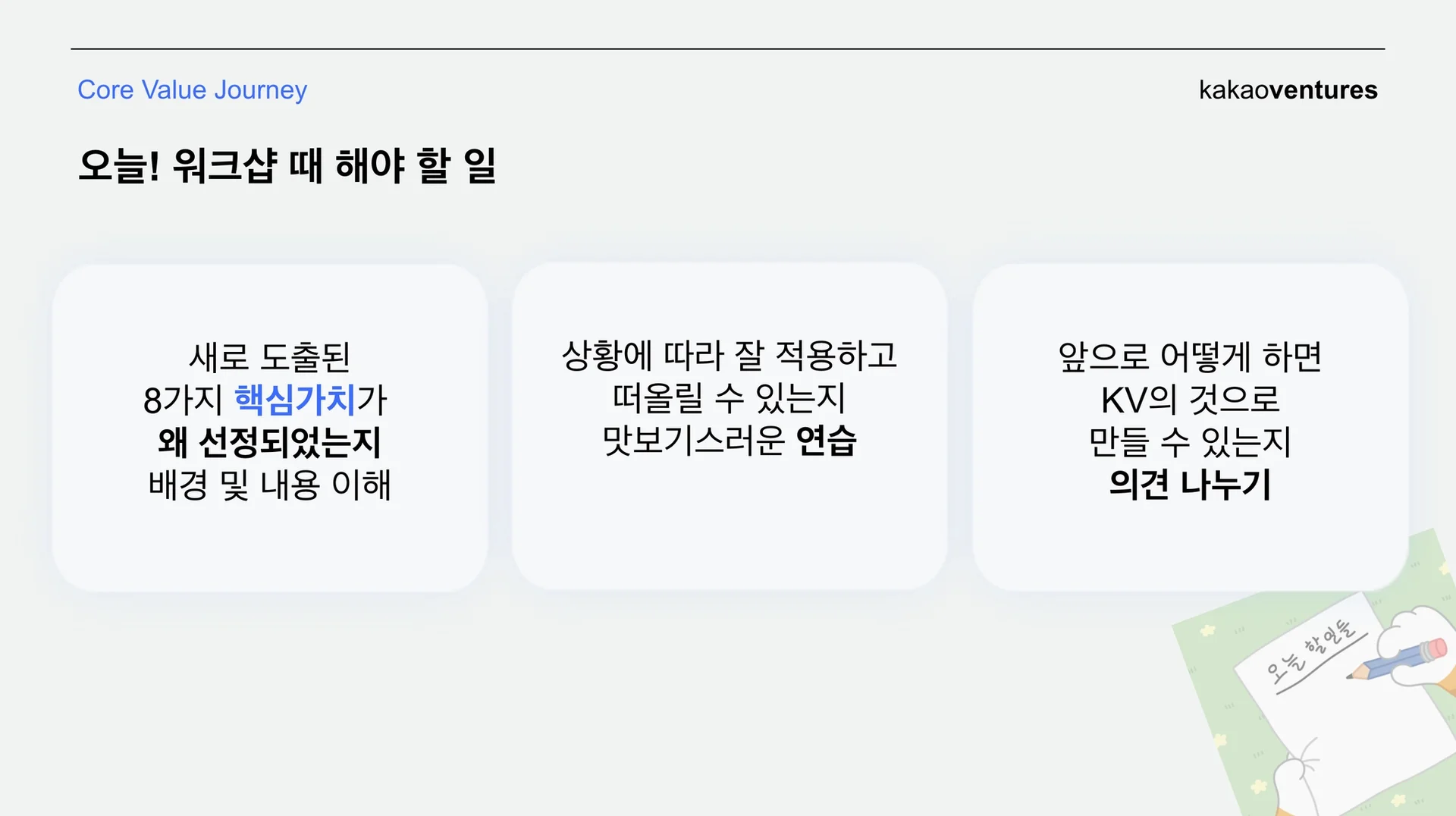 11월 말, 카카오벤처스 전 직원이 한자리에 모였습니다. 여덟 개의 새로운 코어밸류를 나누는 첫 순간이었는데요. 이날 코어밸류 TF의 목표는 모든 구성원이 코어밸류를 동일하게 이해할 수 있도록 명확하게 전달하는 것이었습니다. 세부적인 의도나 맥락이 명확해야만 사람들이 실천으로 옮길 수 있을 테니까요.