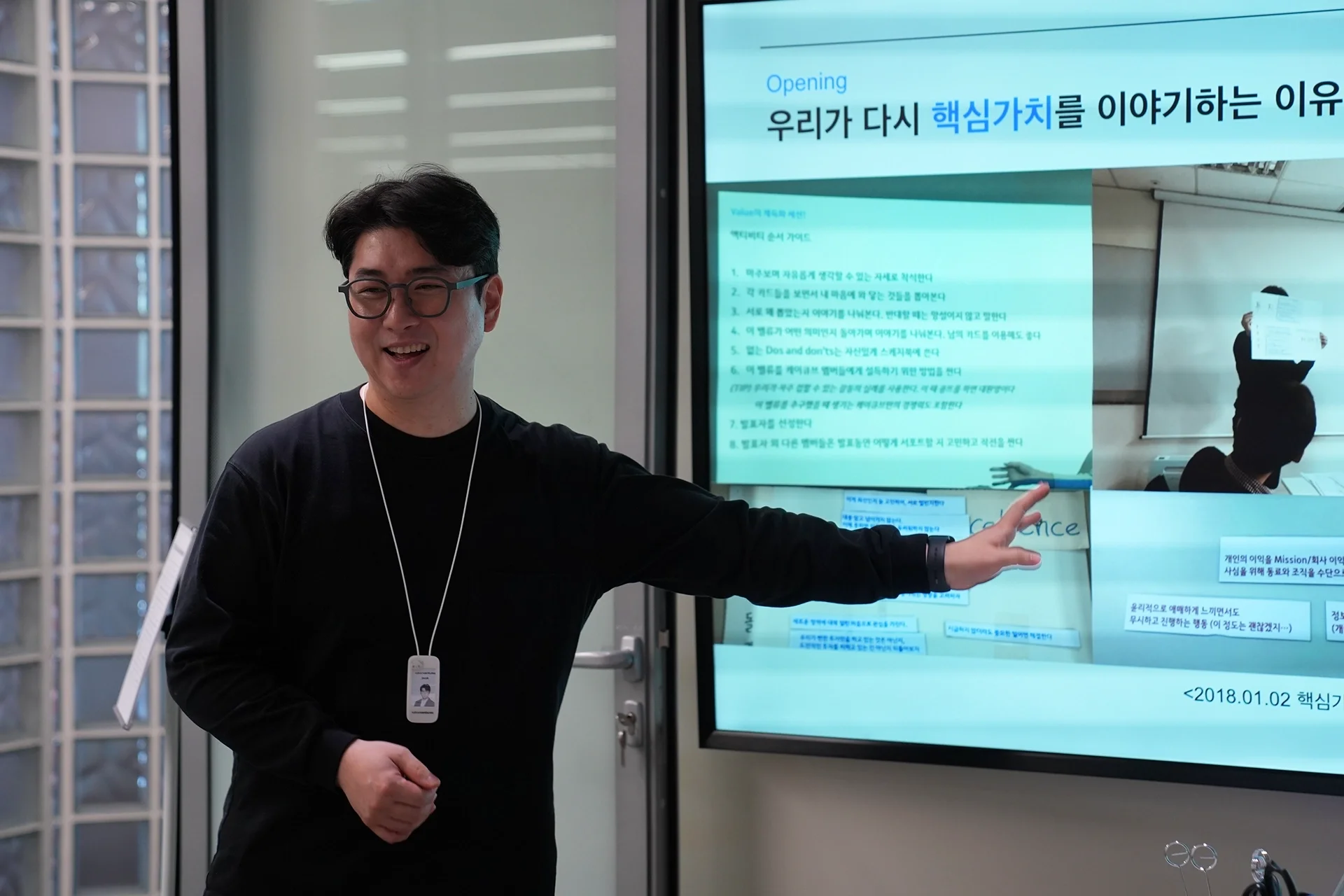가장 먼저 코어밸류가 왜 필요한지, 어떤 데이터를 기반으로 만들었는지, 새로운 8개의 가치가 각각 어떤 의미인지를 함께 이야기했어요. 오프닝은 코어밸류 TF의 리더, 제이콥이 맡아주셨습니다!