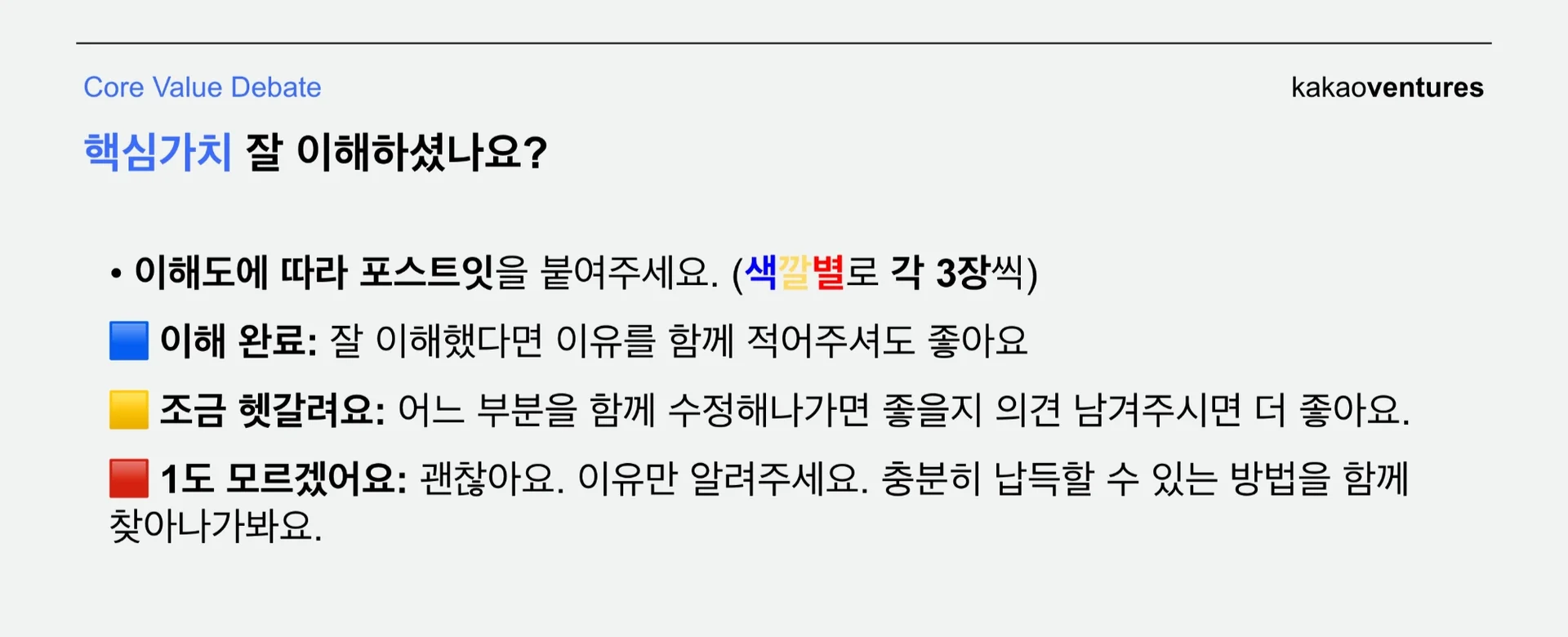 카카오벤처스에서는 오래전부터 원활한 의사결정을 위해 어떻게 말해야 하는지를 진지하게 고민해 왔는데요. 그 과정에서 배운 ‘잘 소통하는 방법’이 켜켜이 쌓여 지금의 코어밸류에 녹아들었다고 볼 수도 있을 듯합니다.