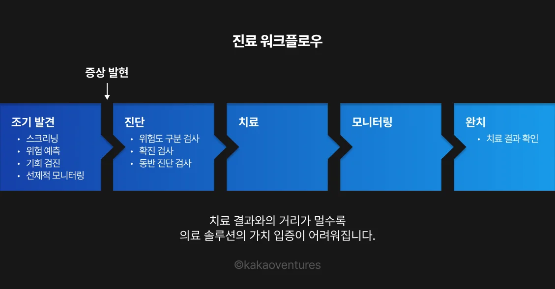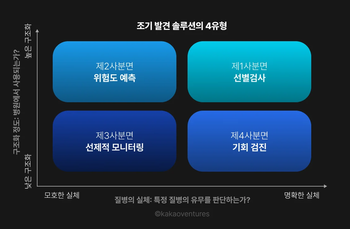 조기 발견(Early Detection)은 현재 의료 AI 시장에서 가장 주목받고 있는 영역 중 하나입니다. 증상이 나타나기 전에 질병을 찾아내 치료한다면 환자의 생존율을 획기적으로 높이고, 국가 차원의 막대한 의료비도 절감할 수 있겠죠. 성공만 한다면 환자, 의료 시스템, 스타트업 모두에게 이득이 되는 시장입니다.