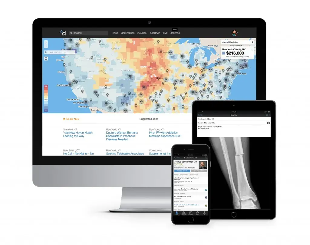 Doximity는 압도적인 의사 네트워크를 경쟁력으로 삼은 플레이어입니다. 2010년 설립 당시, 모바일 보안 팩스(E-FAX) 서비스를 통해 의사들을 플랫폼으로 끌어모았죠. 팩스 기기 없이 보호 규정을 준수할 수 있게 해줌으로써, 2025년 현재 미국 의사의 80% 이상이 가입한 최대 의료전문 네트워크로 성장했습니다.