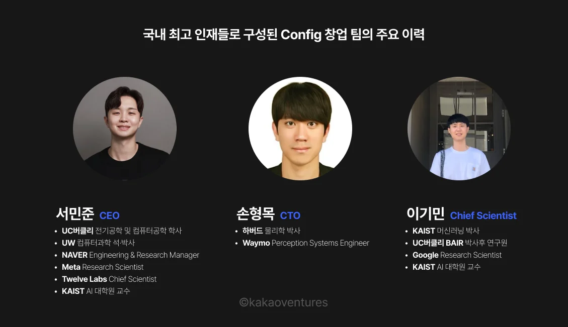 컨피그는 뛰어난 기술력만큼이나 탄탄한 팀 구성이 강점입니다. 서민준 CEO는 네이버, 메타, 트웰브랩스 등 빅테크와 스타트업을 두루 거쳐 현재 KAIST 교수로 재직 중인 선도적인 AI 전문가로, 학계와 현업을 넘나들며 손꼽히는 R&D 성과를 내고 있습니다. 손형목 CTO는 하버드 물리학 박사 출신으로, 웨이모에서 자율주행 시스템의 비전 센서 등 인지 시스템 성능 개선 및 검증을 수행했습니다. 이기민 Chief Scientist는 UC버클리 BAIR, 구글을 거쳐 현재 KAIST 교수를 겸임하고 있으며, 역시 학계와 현업을 넘나들며 로보틱스와 AI 분야의 선도적인 연구를 이어가고 있습니다.