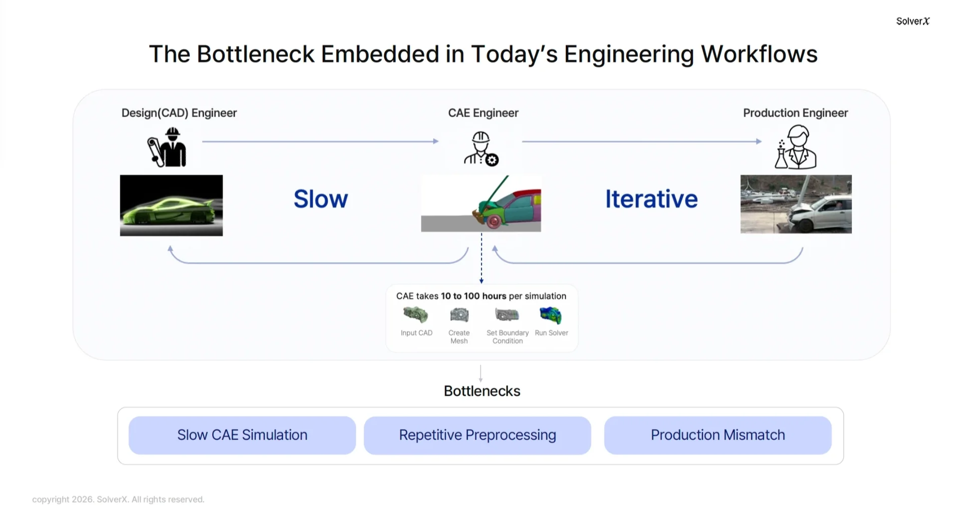 솔버엑스는 이 세 가지 병목을 동시에 공략합니다. 고객이 기존에 축적해 온 시뮬레이션 및 생산 데이터를 기반으로 파인튜닝한 높은 수준의 Physics 모델 기반 솔버를 통해, 매우 높은 정확도의 시뮬레이션 결과를 수초 안에 생성합니다. 별도의 고도화된 컴퓨팅 인프라 없이도 동작하기 때문에 고객은 빠르게 도입할 수 있죠.