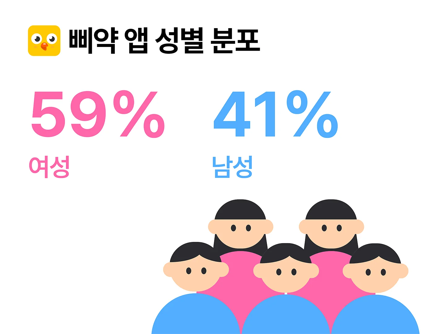 성비도 마찬가지로 놀라웠는데요. 체중 관리 앱은 통상적으로 여성 이용자의 비율이 압도적이지만, 삐약은 여성 60%, 남성 40%로 남성 비율이 이례적으로 높습니다. 삐약이 3040 남성이 가장 적극적으로 활용하는 건강관리 앱이라 해도 과언이 아닙니다.
