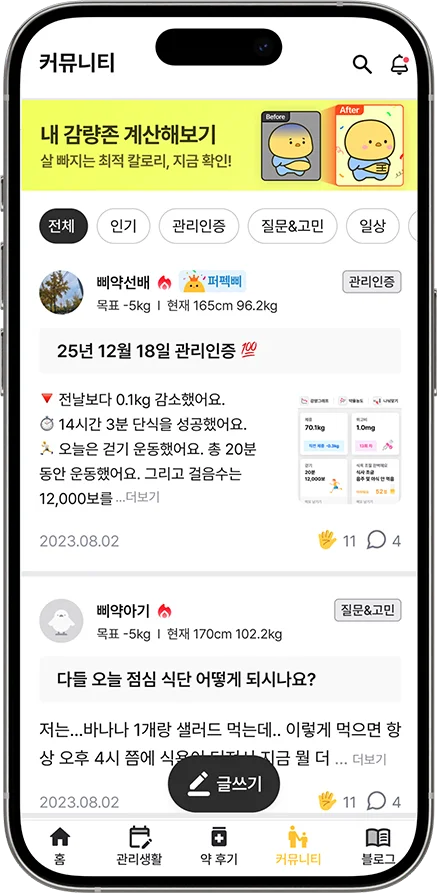 천예슬 대표 정체기를 돌파한 분들은 운동 기록이 평균의 2배 이상 많고, 체중 기록은 4배 이상 많았습니다. 주사 시작 4주차에 체중을 20회 이상 기록한 분들의 감량 성공률은 65%였던 반면, 4회 이하로 기록한 분들은 27%에 그쳤죠. 무려 2.4배의 차입니다.
