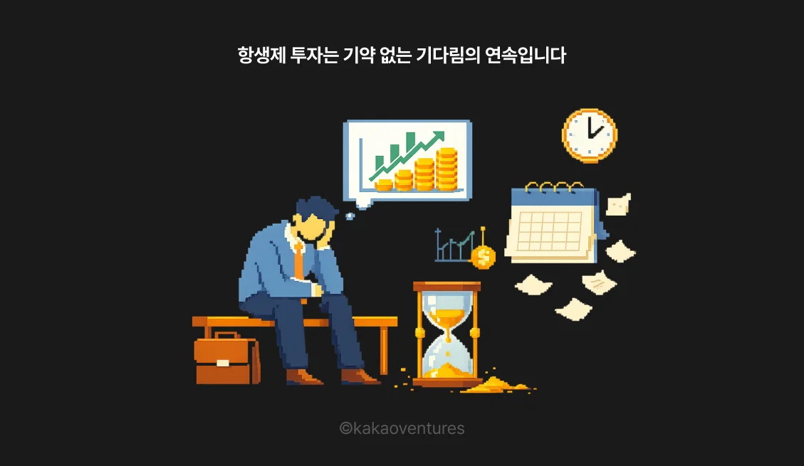 숫자가 이 구조적 문제를 더 직접적으로 보여줍니다. 2020년 기준 암 분야 기업들이 조달한 투자금은 70억 달러였던 반면, 항생제 개발사가 조달한 투자금은 1억 6천만 달러에 불과했는데요. 같은 해, 같은 시장에서 44배의 차이가 난 것입니다.